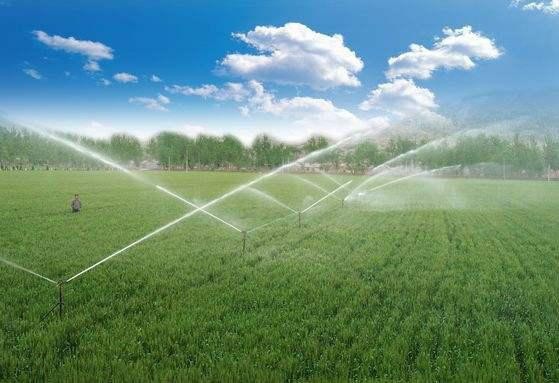 噴灌, 是把水用水泵加壓, 或利用山區地形高差產生的壓力水, 用管道送到田間, 用噴頭射到空中, 再均勻灑落農田, 是小范圍的“ 人工降雨”。適用于大田或山地粗壯的作物。因雨量可以控制, 避免產生深層滲漏, 故比溝灌節水40 % ~ 60 %。由于對水質要求相對較低、及造價較低, 所以應用面積最大。
