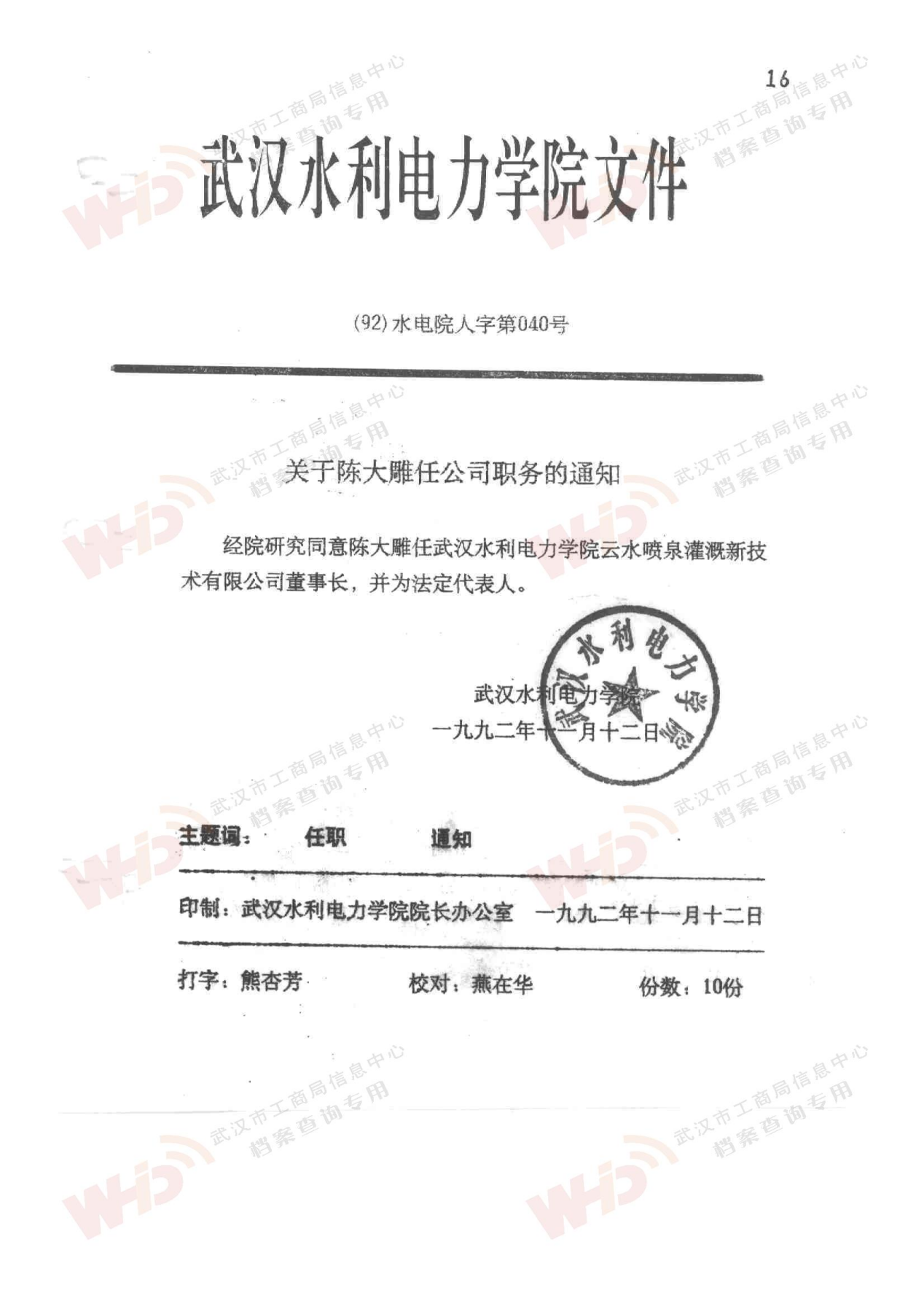 - 1992年11月12日任命陳大雕同志為武漢水利電力學院云水噴泉灌溉新技術有限公司董事長,并為法定代表人