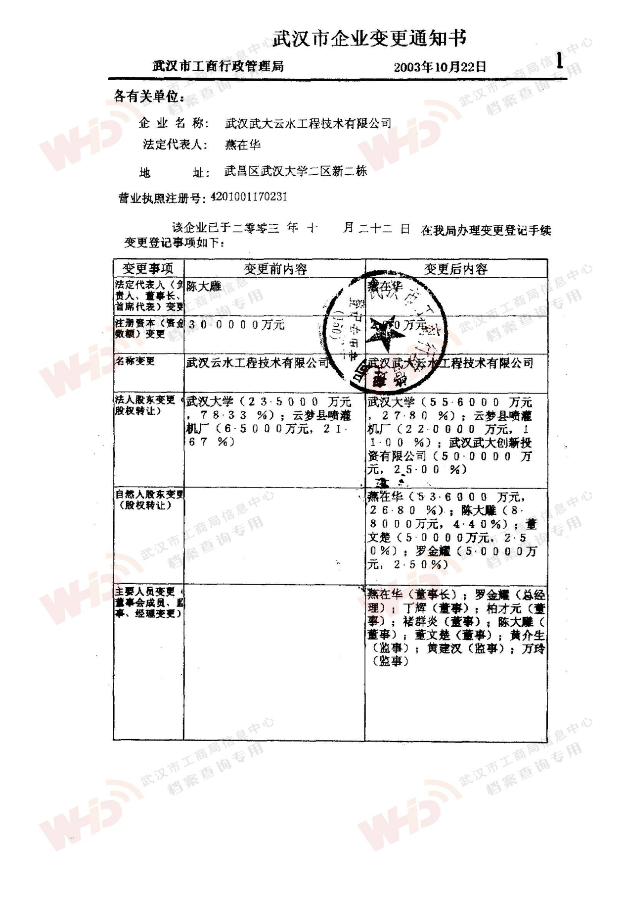 - 2003年10月22日企業法定代表人由陳大雕變更為燕在華。