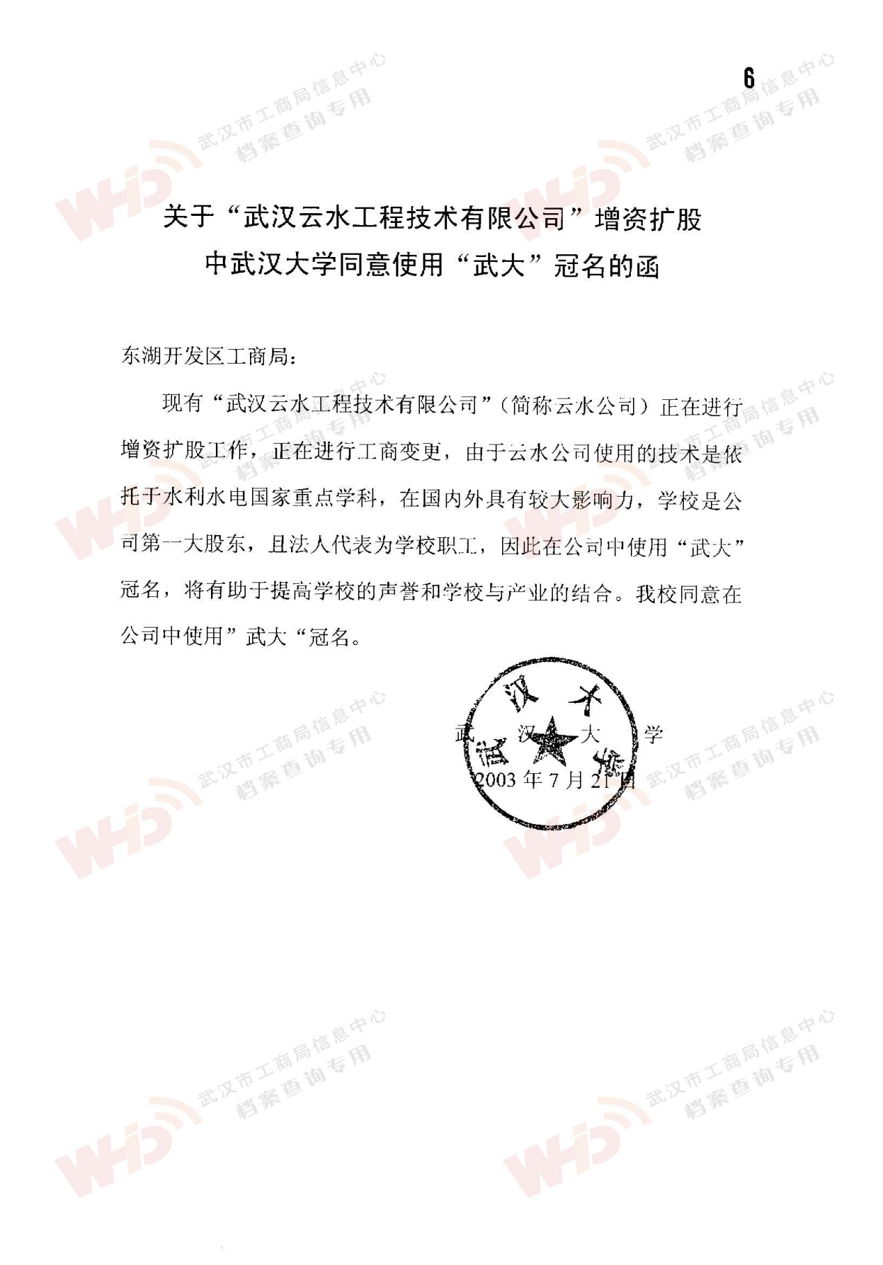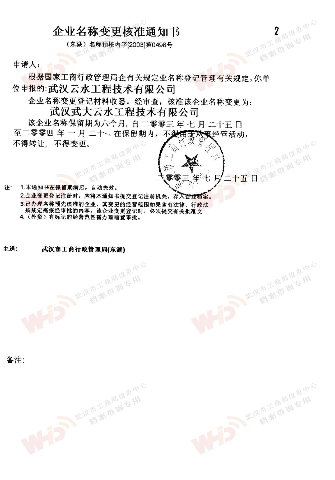 - 2003年7月25日公司名變更為武漢武大云水工程技術有限公司。武漢大學同意使用“武大”冠名。