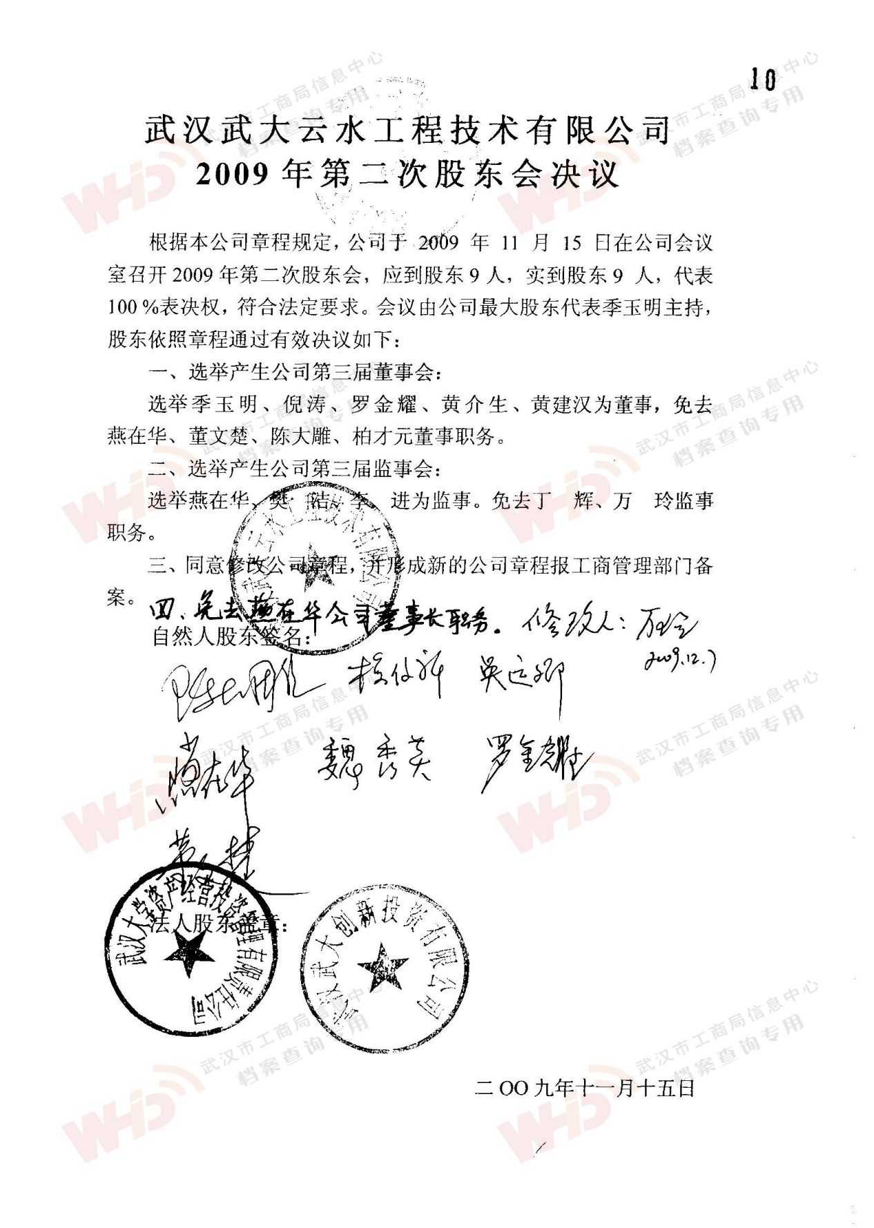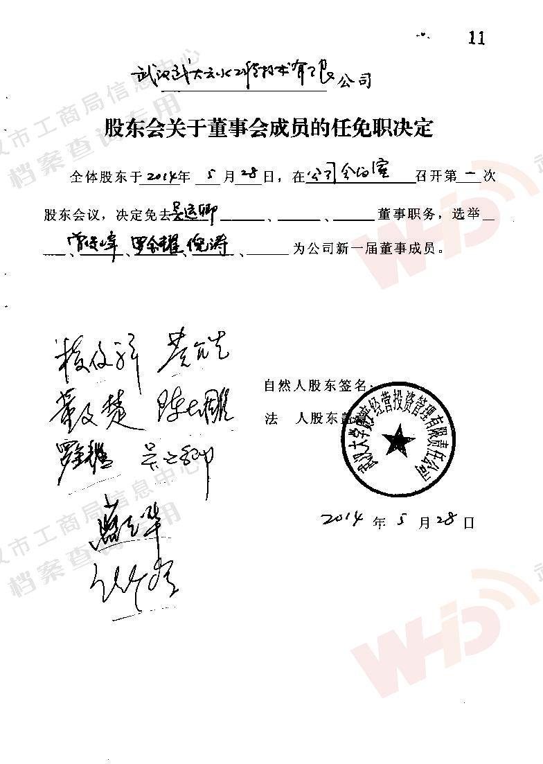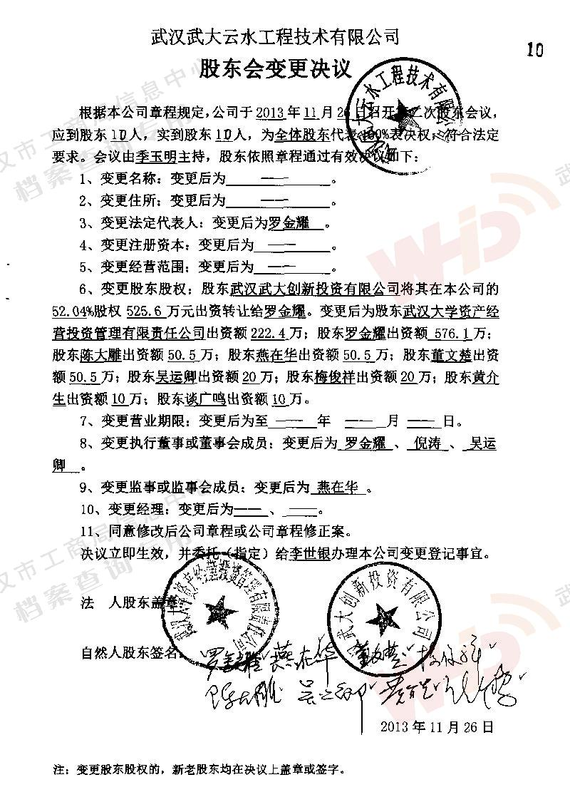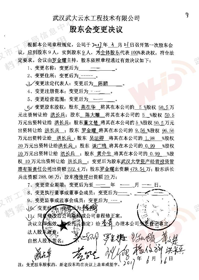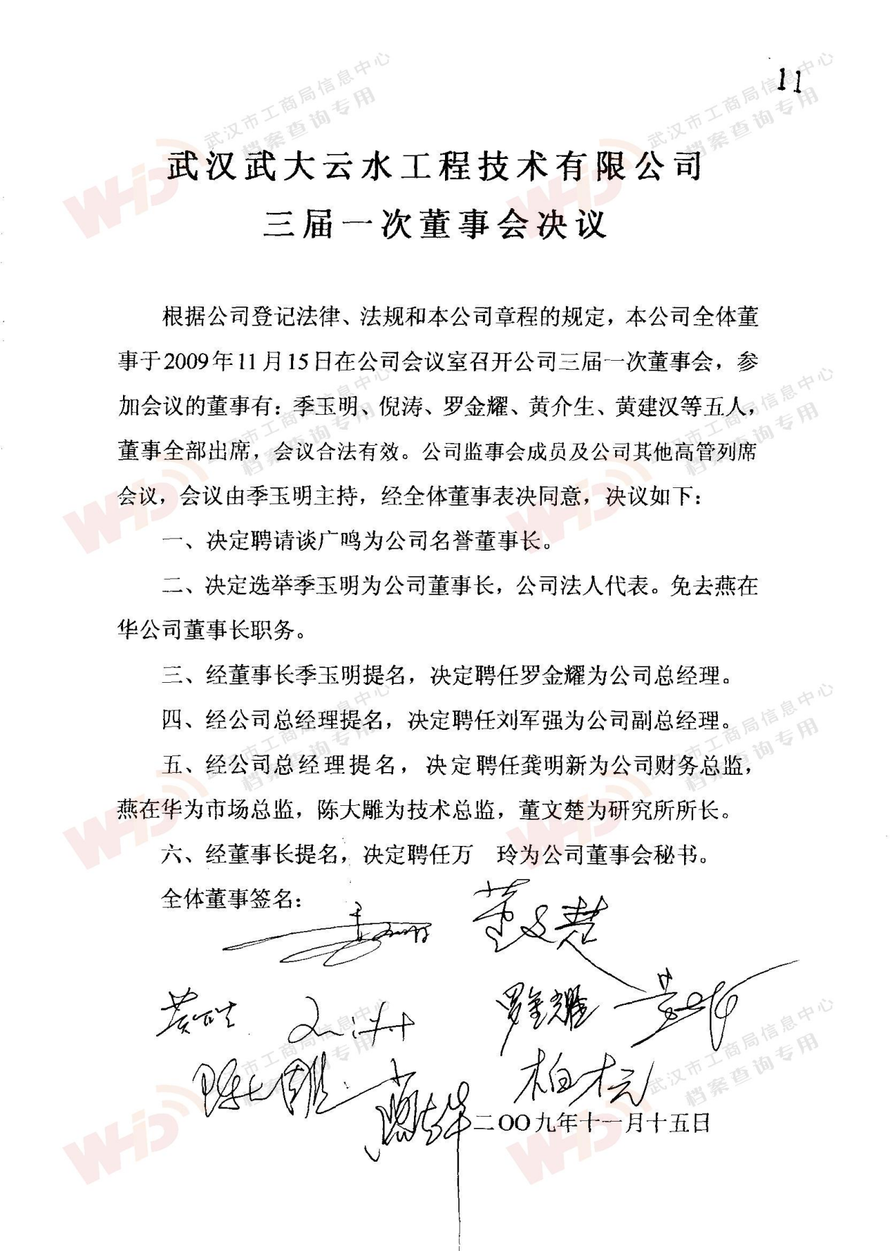 - 2009年11月15日武漢武大云水工程技術有限公司三屆一次董事會決議: 一、決定聘請談廣鳴為公司名譽董事長。 二、決定選舉季玉明為公司董事長,公司法人代表。免去燕在華公司董事長職務。 三、經董事長季玉明提名,決定聘任羅金耀為公司總經理。 四、經公司總經理提名,決定聘任劉軍強為公司副總經理。 五、經公司總經理提名,決定聘任龔明新為公司財務總監,燕在華為市場總監,陳大雕為技術總監,董文楚為研究所所長。 經董事長提名,決定聘任萬玲為董事會秘書。