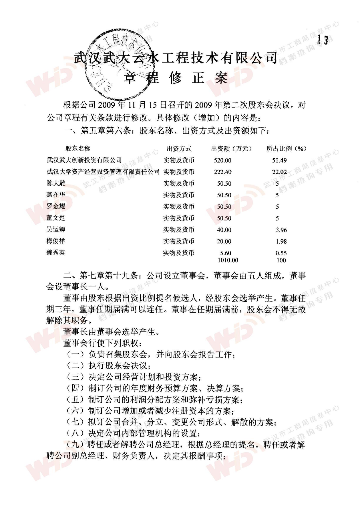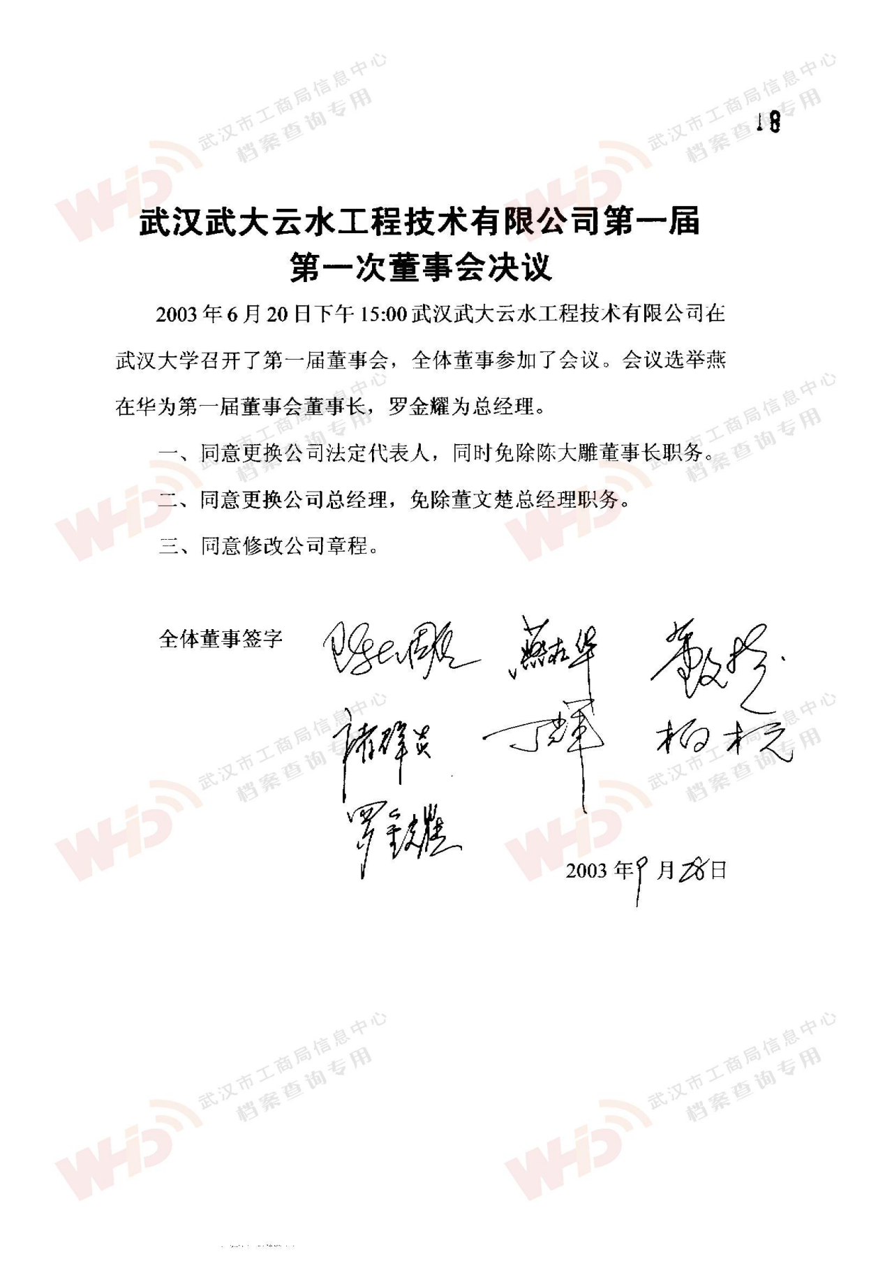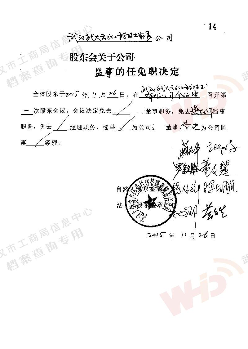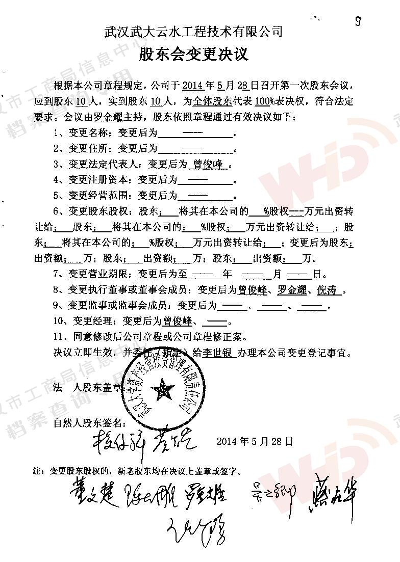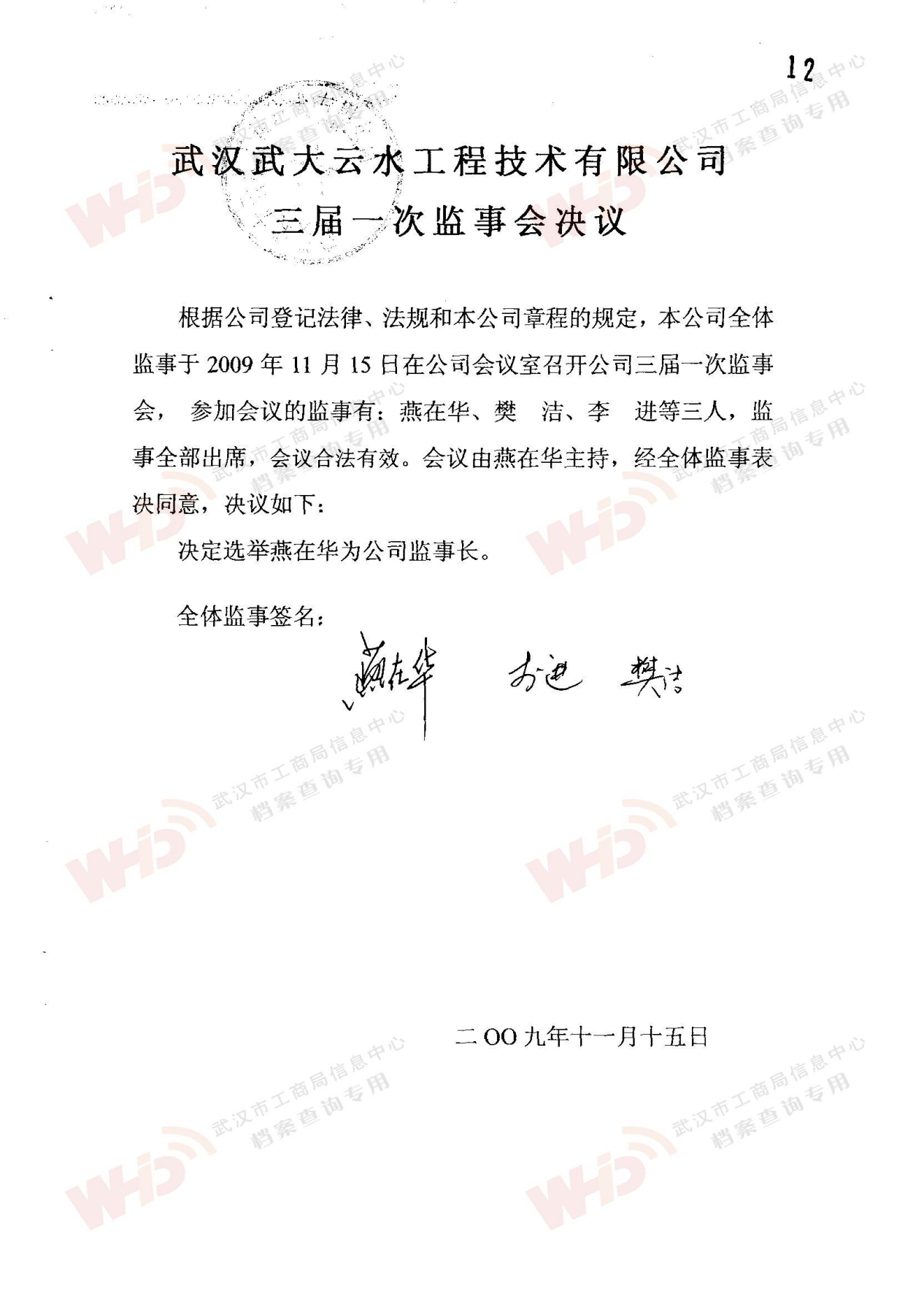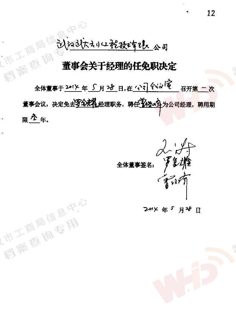 - 2009年11月15日武漢武大云水工程技術有限公司三屆一次董事會決議: 一、決定聘請談廣鳴為公司名譽董事長。 二、決定選舉季玉明為公司董事長,公司法人代表。免去燕在華公司董事長職務。 三、經董事長季玉明提名,決定聘任羅金耀為公司總經理。 四、經公司總經理提名,決定聘任劉軍強為公司副總經理。 五、經公司總經理提名,決定聘任龔明新為公司財務總監,燕在華為市場總監,陳大雕為技術總監,董文楚為研究所所長。 經董事長提名,決定聘任萬玲為董事會秘書。