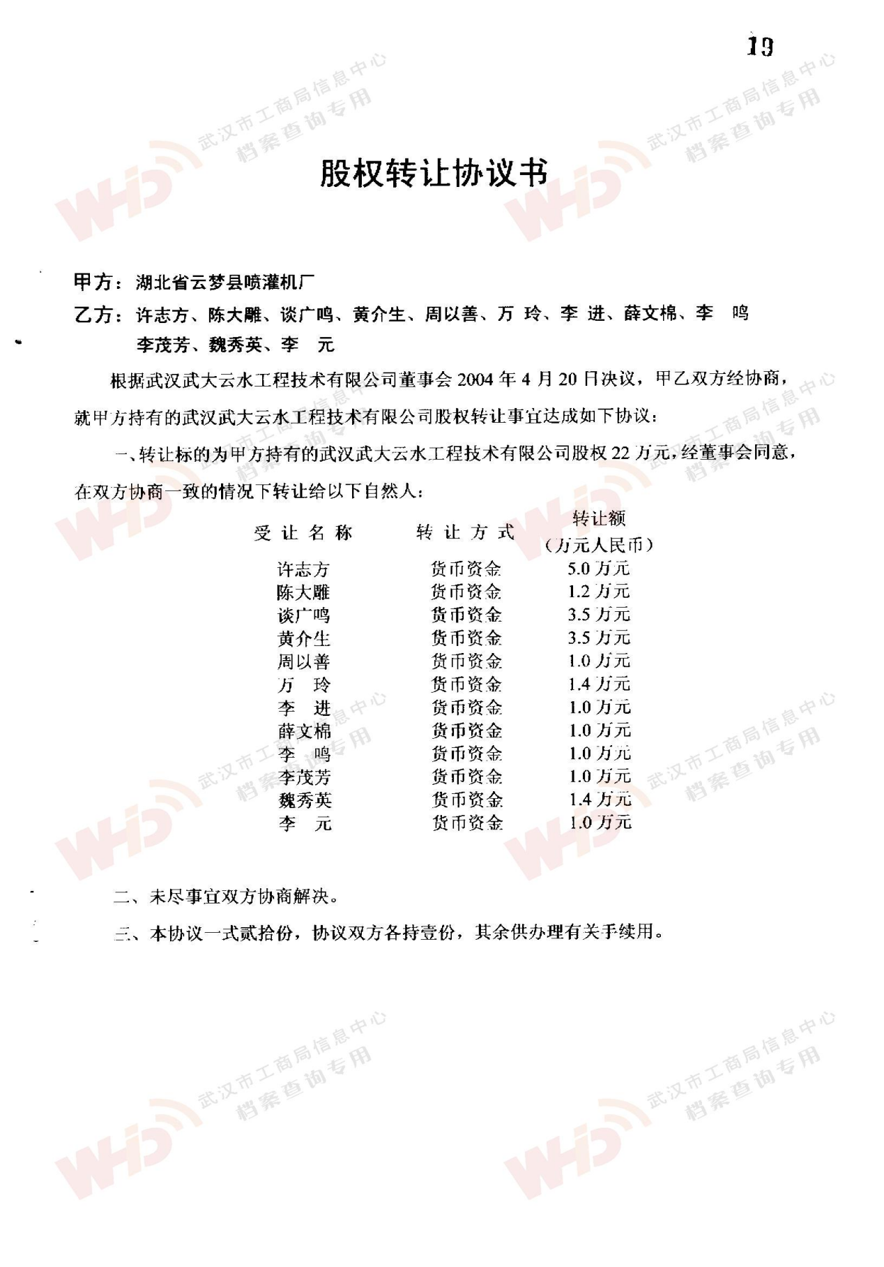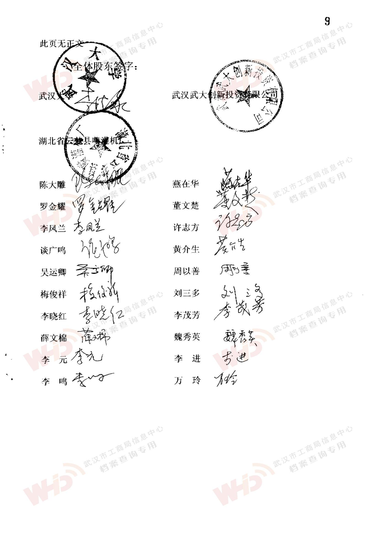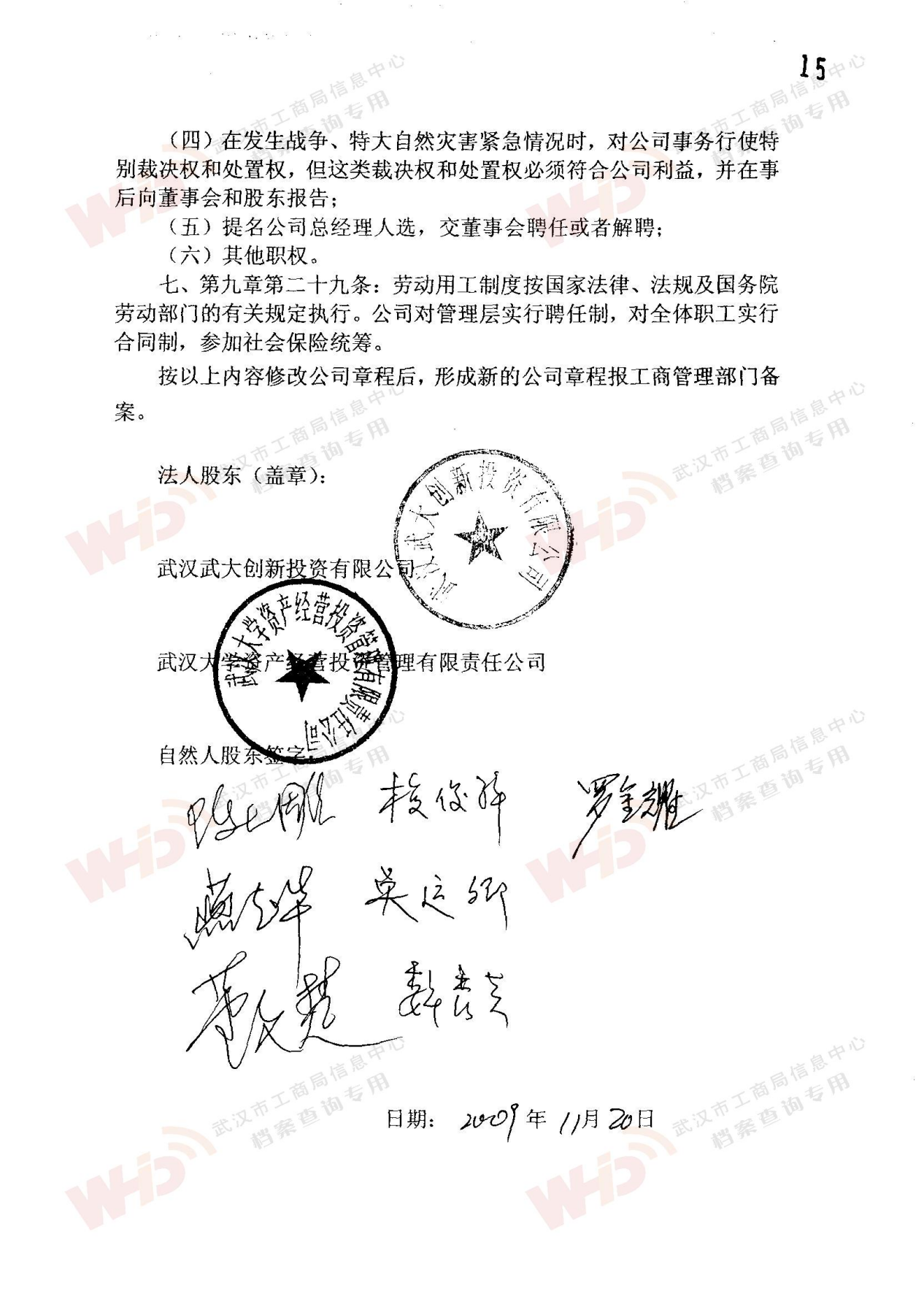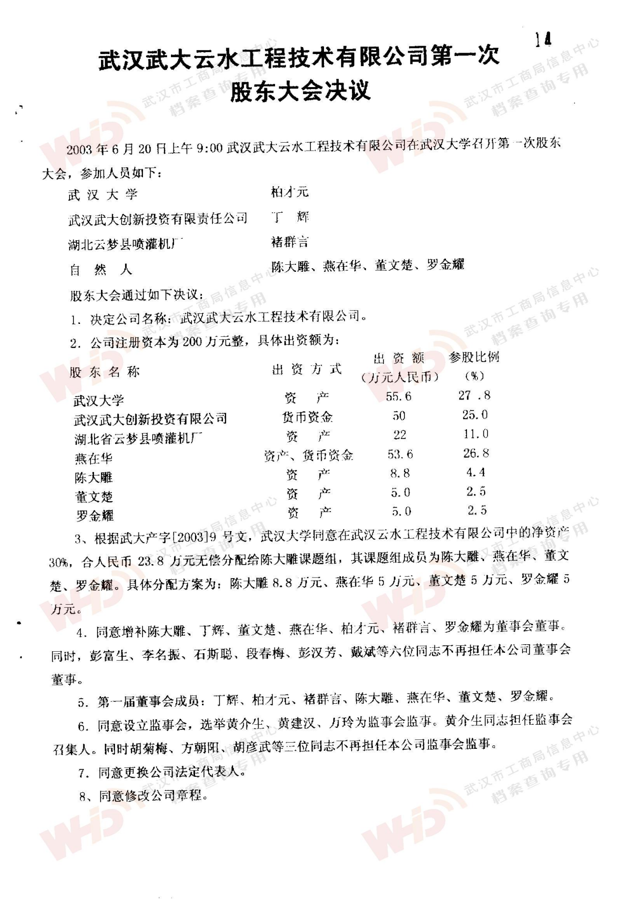 - 2009年11月15日武漢武大云水工程技術有限公司三屆一次董事會決議: 一、決定聘請談廣鳴為公司名譽董事長。 二、決定選舉季玉明為公司董事長,公司法人代表。免去燕在華公司董事長職務。 三、經董事長季玉明提名,決定聘任羅金耀為公司總經理。 四、經公司總經理提名,決定聘任劉軍強為公司副總經理。 五、經公司總經理提名,決定聘任龔明新為公司財務總監,燕在華為市場總監,陳大雕為技術總監,董文楚為研究所所長。 經董事長提名,決定聘任萬玲為董事會秘書。
