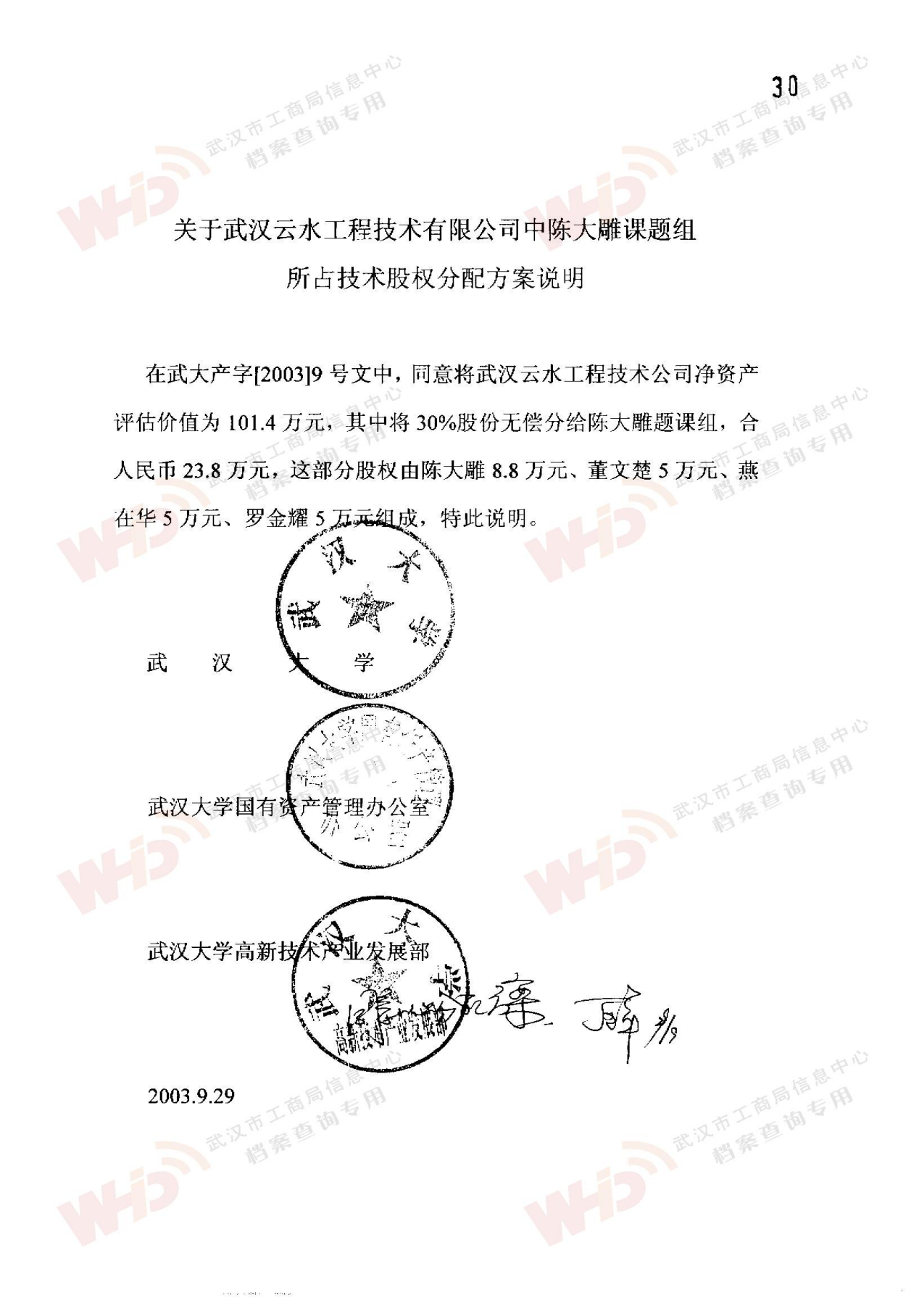 - 2003年9月29日武漢大學國有資產管理辦公室無償將所持有股份中的30%給與陳大雕課題組。