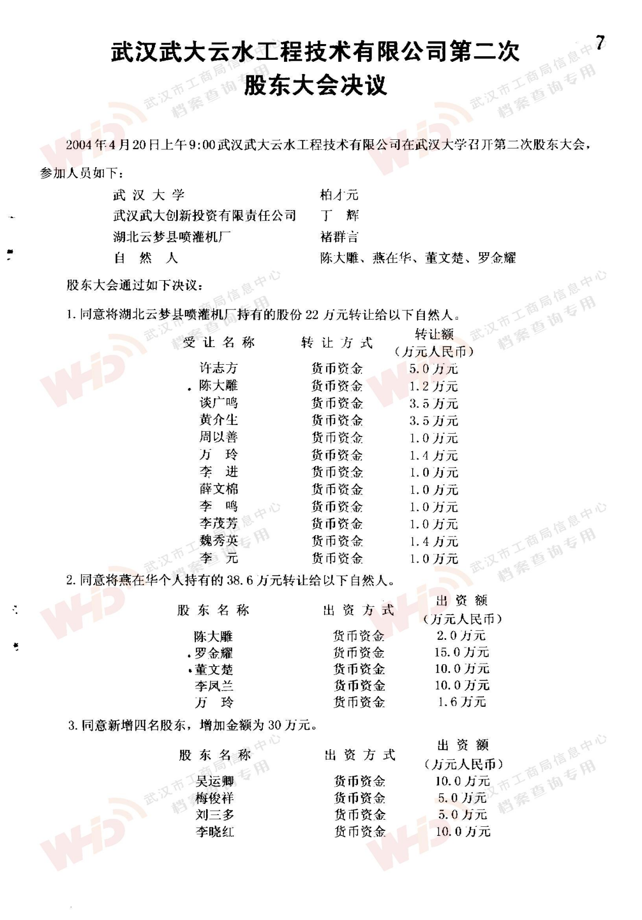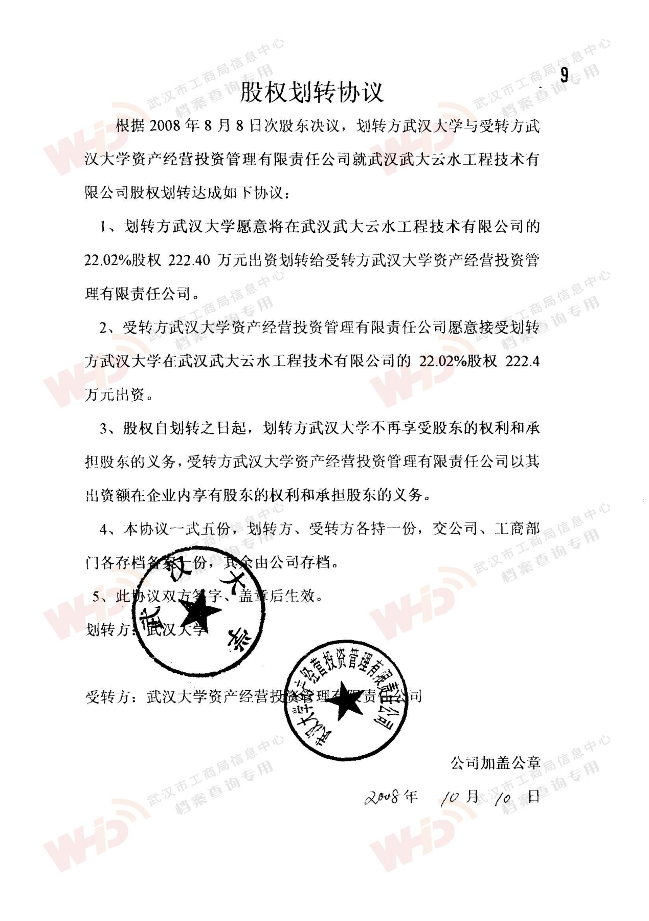 - 2008年8月8日武漢大學同意將所持武大云水股份劃轉給武漢大學資產經營投資管理有限責任公司。