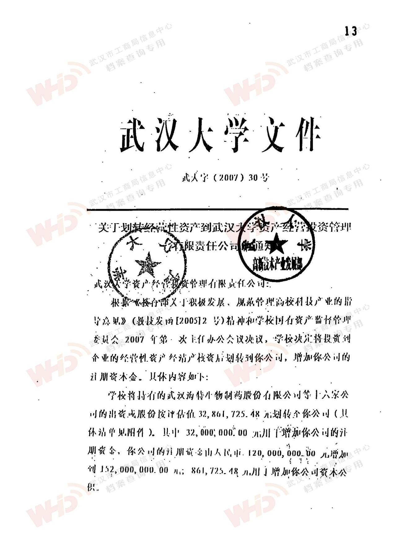 - 2007年7月30號武漢大學發文:關于劃轉經營性資產到武漢大學資產經營投資管理有限責任公司的通知