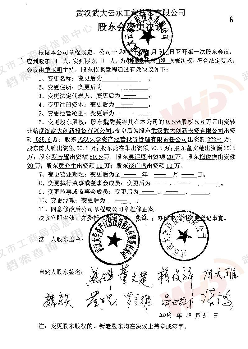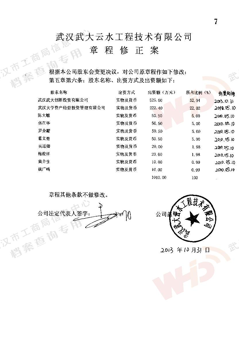 - 2013年10月31日對公司股東名稱、出資方式及出資額做出調整。